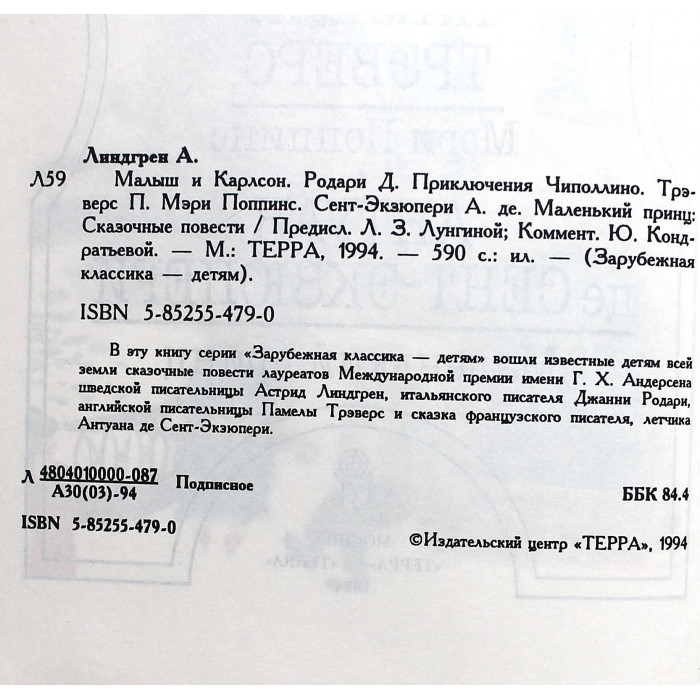 В эту книгу серии "Зарубежная классика - детям" вошли известные детям всей земли сказочные повести лауреатов Международной премии имени Г.Х.Андерсена шведской писательницы Астрид Линдгрен, итальянского писателя Джанни Родари, английской писательницы Памелы Трэверс и сказка французского писателя, летчика Антуана де Сент-Экзюпери.