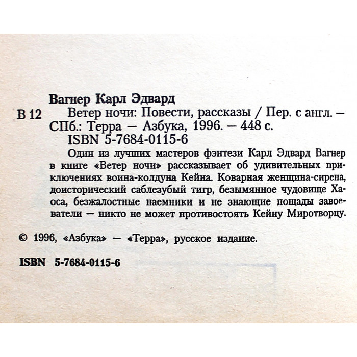 Один из лучших мастеров фэнтези Карл Эдвард Вагнер в книге 'Ветер ночи' рассказывает об удивительных приключениях воина - колдуна Кейна. Коварная женщина - сирена, доисторический саблезубый тигр, безымянное чудовище Хаоса, безжалостные наемники и не знающие пощады завоеватели - никто не может противостоять Кейну Миротворцу.