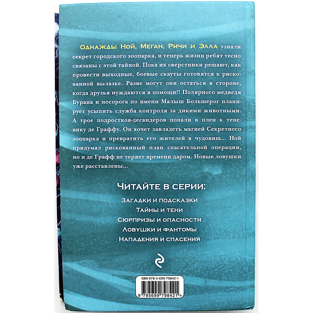 Однажды Ной, Меган, Ричи и Элла узнали секрет городского зоопарка, и теперь жизни ребят тесно связаны с этой тайной. Пока их сверстники решают, как провести выходные, боевые скауты готовятся к рискованной вылазке. Разве могут они остаться в стороне, когда друзья нуждаются в помощи?! Полярного медведя Бурана и носорога по имени Малыш Большерог планирует усыпить служба контроля за дикими животными. А трое подростков-десандеров попали в плен к теневику де Граффу. Он хочет завладеть магией Секретного зоопарка и превратить его жителей в чудовищ... Ной придумал рискованный план спасательной операции, но и де Графф не теряет времени даром. Новые ловушки уже расставлены...