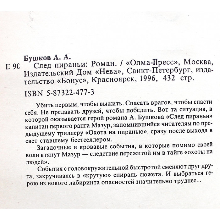 Убить первым, чтобы выжить. Спасать врагов, чтобы спасти себя. Не предавать друзей, чтобы победить. Вот та ситуация, в которой оказывается герой романа А. Бушкова 'След пираньи' капитан первого ранга Мазур, запомнившийся читателям по предыдущему триллеру'Охота на пиранью', сразу после выхода в свет ставшему бестселлером. Загадочные и кровавые события, в которые помимо своей воли втянут Мазур - следствие пережитой им в тайге 'охоты на людей'. События с головокружительной быстротой сменяют друг друга, закручиваясь в 'крутую' спираль сюжета. И выбраться герою из нового лабиринта опасностей значительно труднее.
