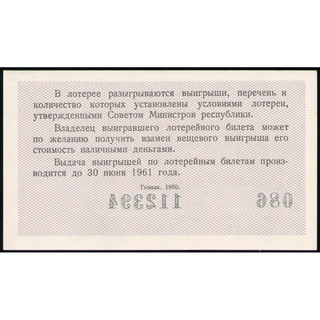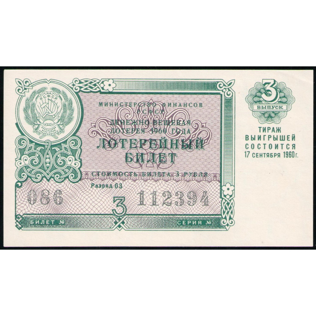 РСФСР , Лотерейный билет , 3 Рубля 1960 год , Денежно-Вещевая лотерея