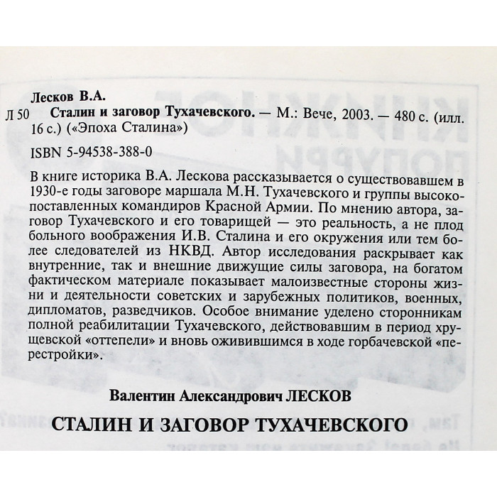 В книге историка В.А.Лескова рассказывается о существовавшем в 1930-е годы заговоре маршала М.Н.Тухачевского и группы высокопоставленных командиров Красной Армии. По мнению автора, заговор Тухачевского и его товарищей - это реальность, а не плод больного воображения И.В.Сталина и его окружения или тем более следователей из НКВД.