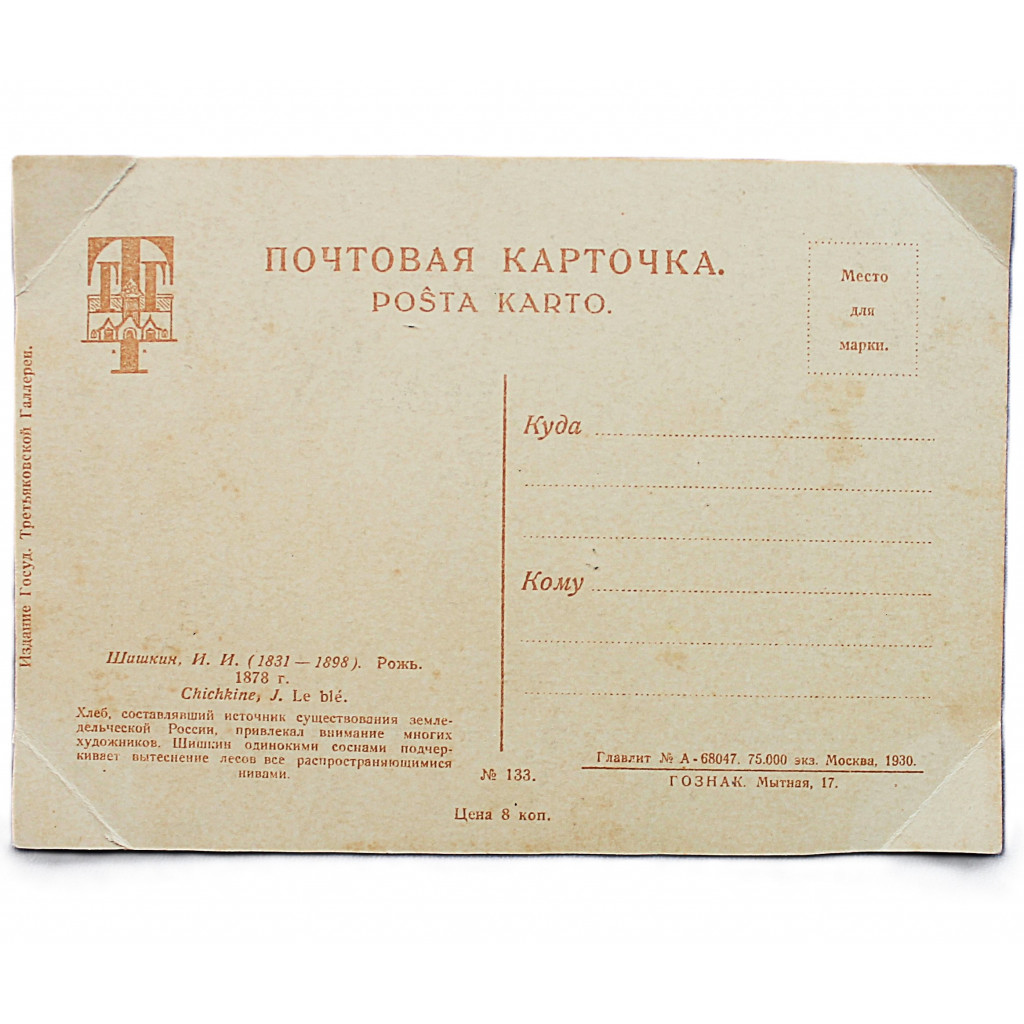 СССР почтовая открытка «РОЖЬ». Шишкин И.И. (Изд. ГТГ, 1930) Чистая. Оригинал. Посткроссинг