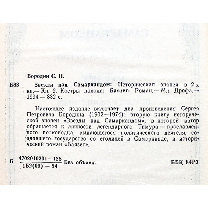 Настоящее издание включает два произведения Сергея Петровича Бородина: вторую книгу исторической эпопеи "Звезды над Самаркандом", в которой автор обращается к личности легендарного Тимура - прославленного полководца, выдающегося политического деятеля, создавшего государство со столицей в Самарканде; и исторический роман "Баязет".