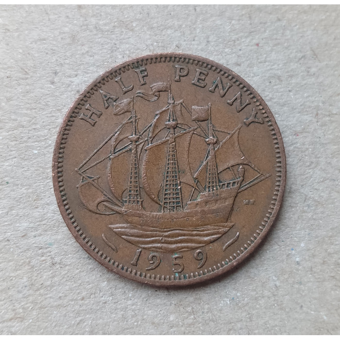 Великобритания 1/2 Пенни 1959 год , Английский галеон Золотая лань, Елизавета 2