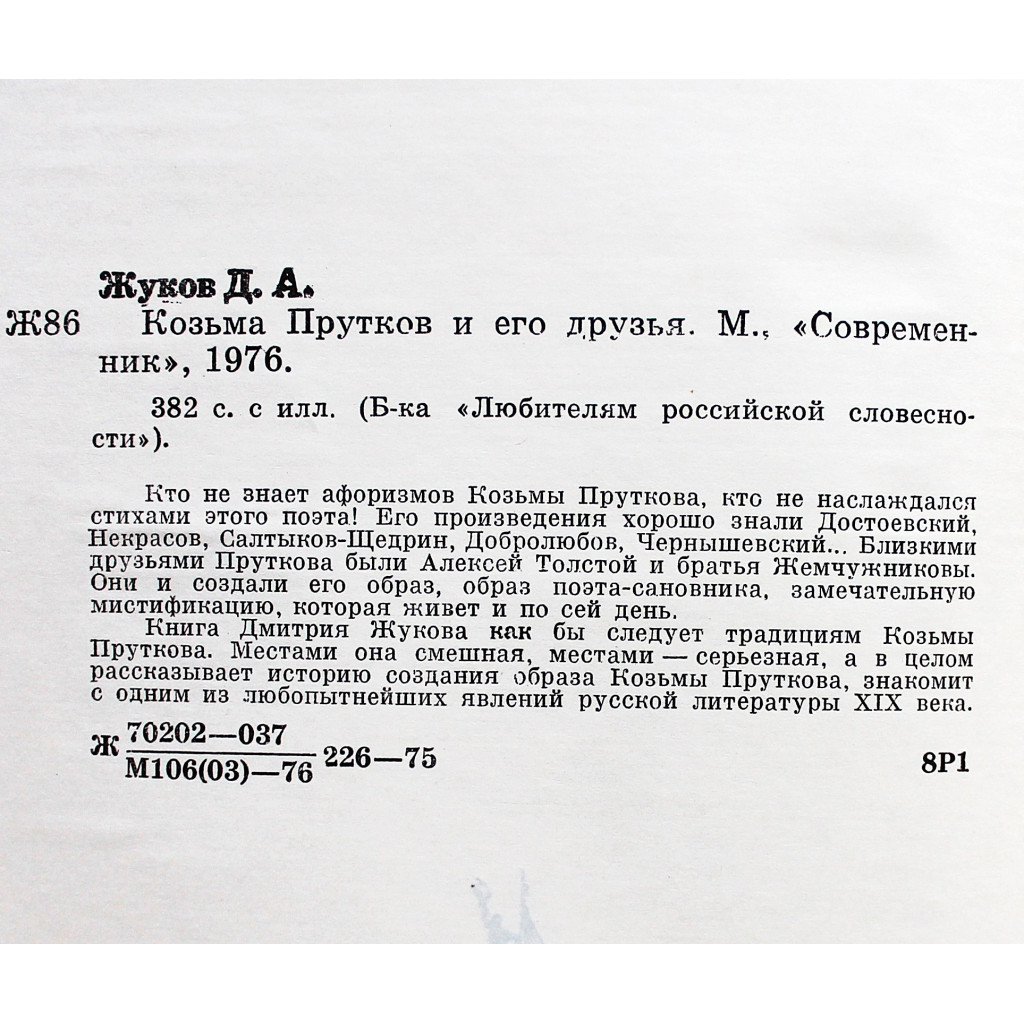 Исследование Дмитрия Жукова "Козьма Прутков и его друзья", раскрывающее тайну создания литературной мистификации, рассказывающее о талантливейших людях XIX века.