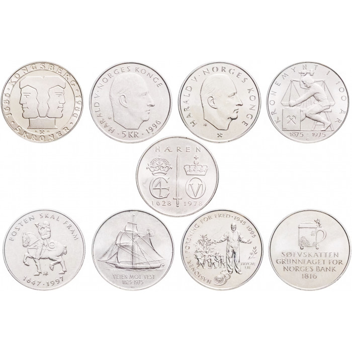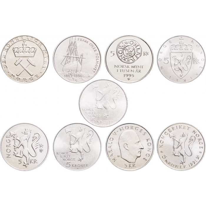 Норвегия 5 крон 1975-1997 год Набор из 9 монет