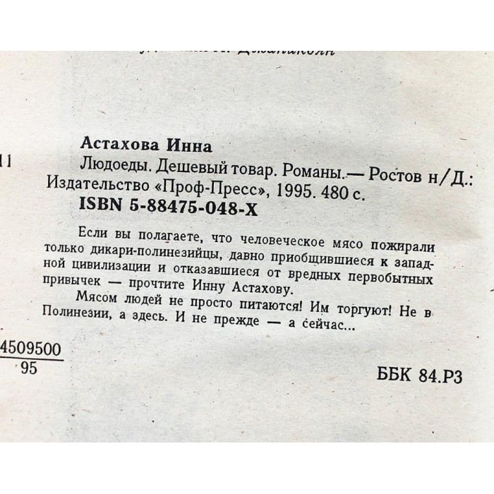 Если вы полагаете, что человеческое мясо пожирали только дикари-полинезийцы, давно приобщившиеся к западной цивилизации и отказавшиеся от вредных первобытных привычек - прочтите Инну Астахову. Мясом людей не только питаются! Им торгуют! Не в Полинезии, а здесь. И не прежде, а сейчас...