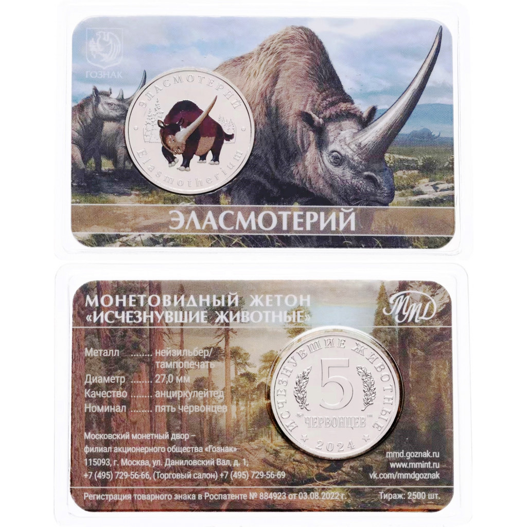 Монетовидный жетон 5 червонцев 2024 год ММД UNC Исчезнувшие животные Эласмотерий В блистере