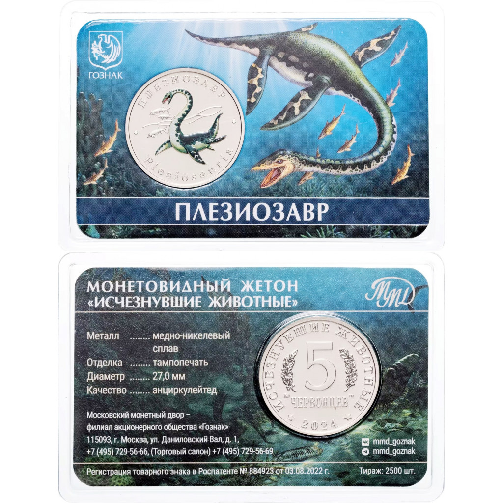 Монетовидный жетон 5 червонцев 2024 год ММД UNC Исчезнувшие животные Плезиозавр В блистере