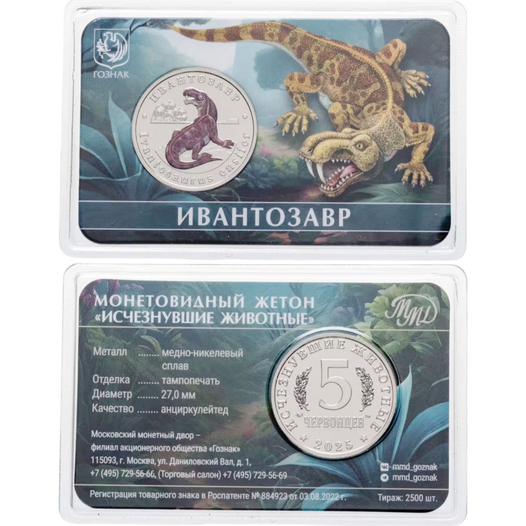 Монетовидный жетон 5 червонцев 2025 год ММД UNC Исчезнувшие животные Ивантозавр В блистере