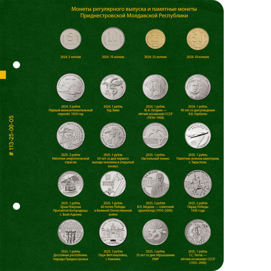 На листе учитываются монеты регулярного выпуска 2024 года, а так же памятные монеты из недрагоценных металлов номиналами 1 и 3 рубля Приднестровской Молдавской Республики (Приднестровья) 2024–2025 гг.