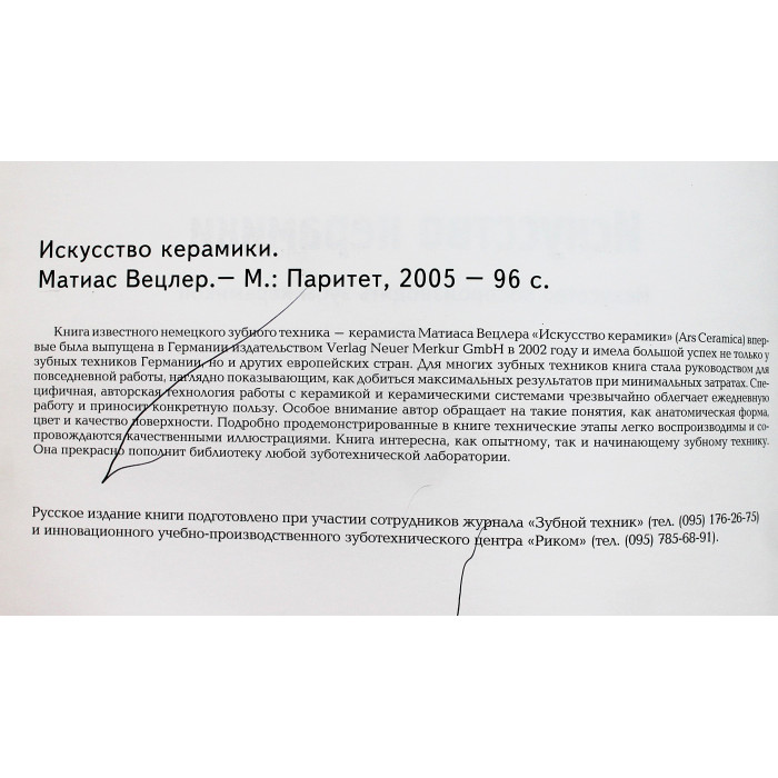 Книга известного немецкого зубного техника — керамиста Матиаса Вендора «Искусство керамики» (Ars Ceramica) впервые была выпущена в Германии издательством Verlag Neuer Merkur GmbH в 2002 году и имела большой успех не только у зубных техников Германии, но и других европейских стран. Для многих зубных техников книга стала руководством для повседневной работы, наглядно показывающим, как добиться максимальных результатов при минимальных затратах.