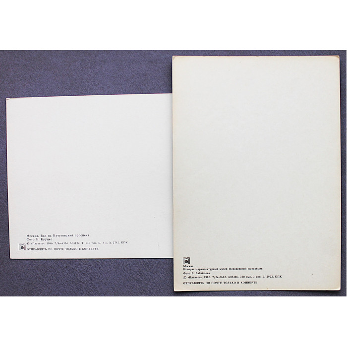 СССР пара открыток «МОСКВА». Вид на Кутузовский проспект. Новодевичий монастырь (1986 год) Чистые. Посткроссинг