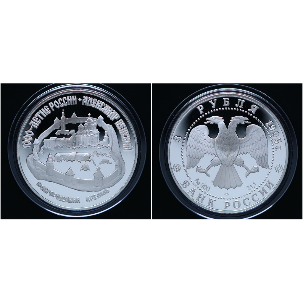 Россия 3 Рубля 1995 ЛМД год Пруф / Proof. Александр Невский. Новгородский Кремль