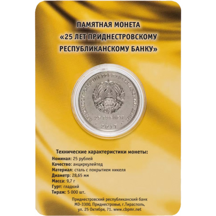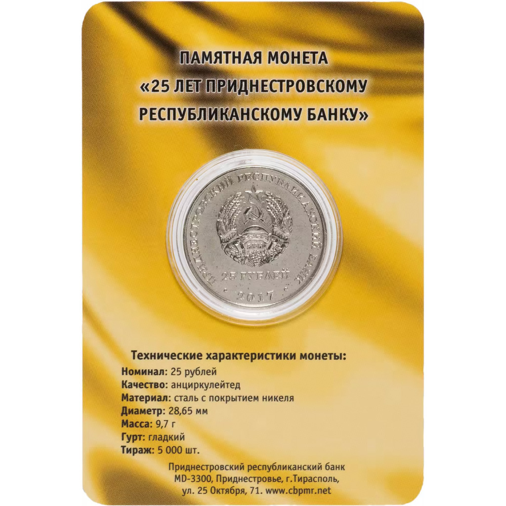 Приднестровье 25 рублей 2017 год UNC UC# 160 25 лет Приднестровскому республиканскому банку