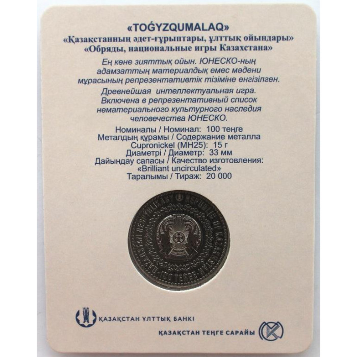 КАЗАХСТАН 100 тенге 2022. Тогыз кумалак. «Обряды, национальные игры» (блистер)