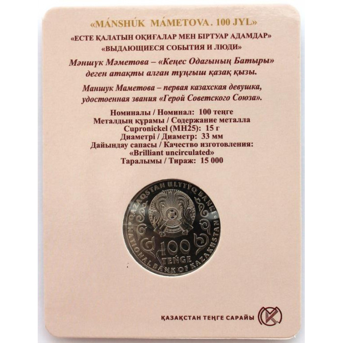 КАЗАХСТАН 100 тенге 2022. Маншук Маметова. 100 со дня рождения (блистер)