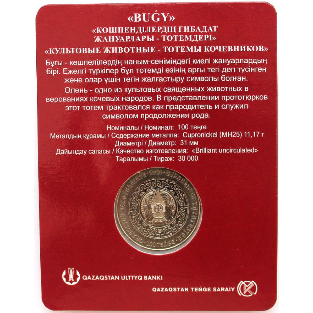 КАЗАХСТАН 100 тенге 2020. Олень (Бугы). «Культовые животные» (блистер)