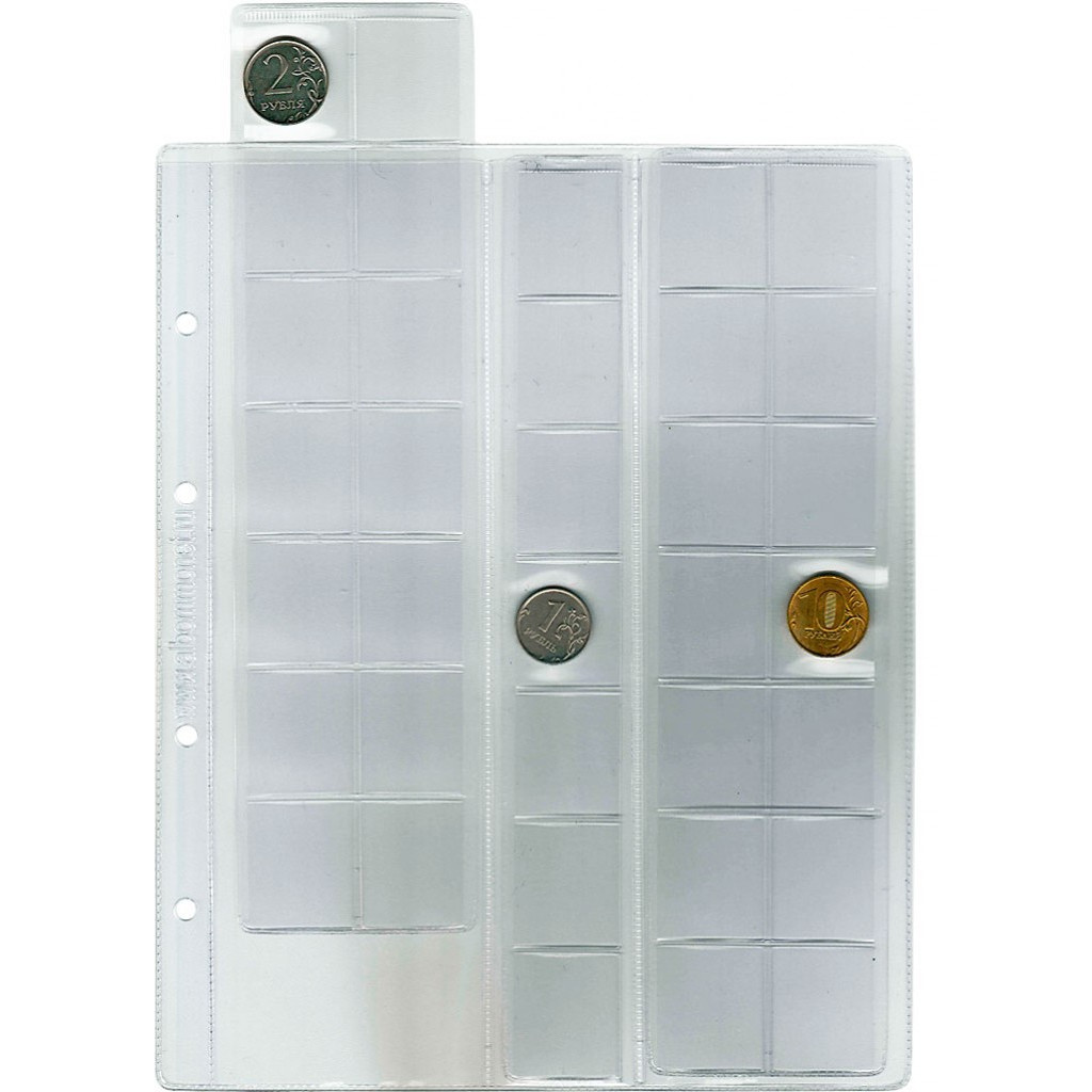 В альбом входит до 20 листов для хранения монет, в зависимости от толщины коллекционного материала.
