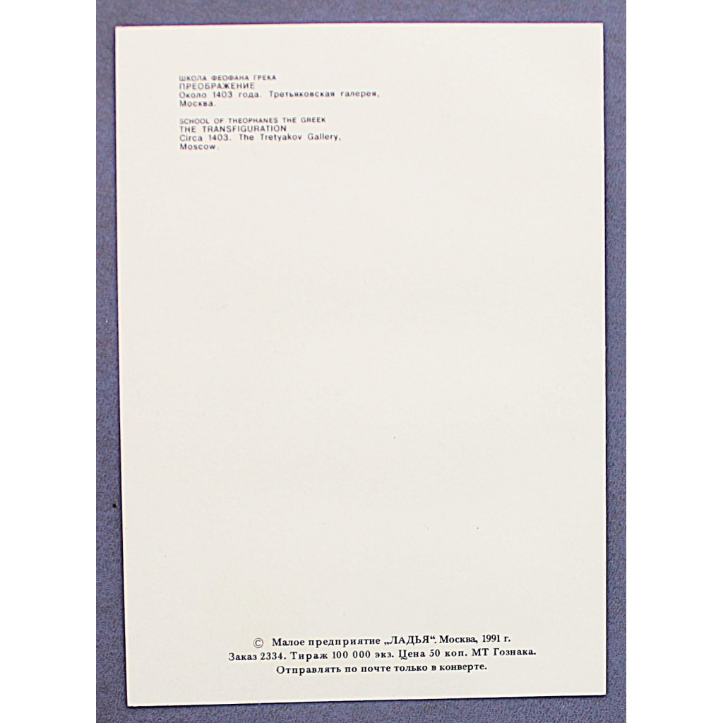 СССР открытка «ПРЕОБРАЖЕНИЕ». Школа Феофана Грека. Около 1403 года (Ладья, 1991) Чистая