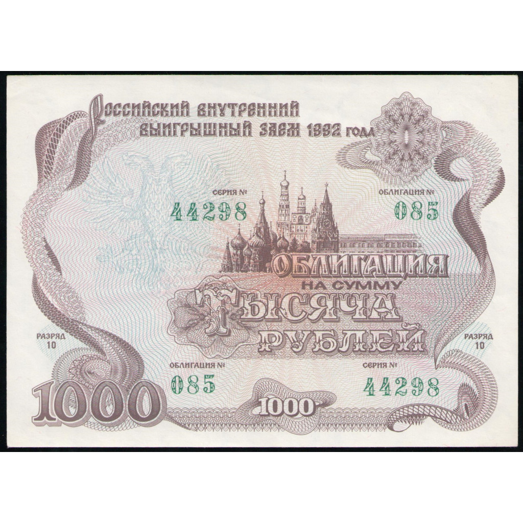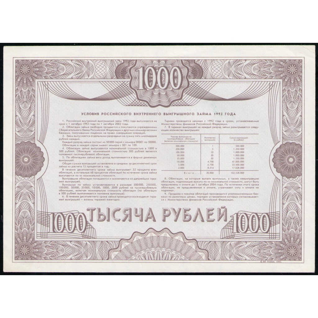 Облигация , Россия 1000 рублей 1992 год , Российский внутренний выигрышный заем