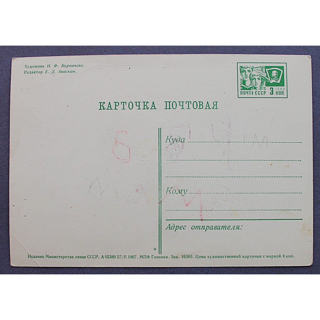 СССР почтовая открытка «ПОЗДРАВЛЯЮ!» (Мин связи, 1967) Кирпичева