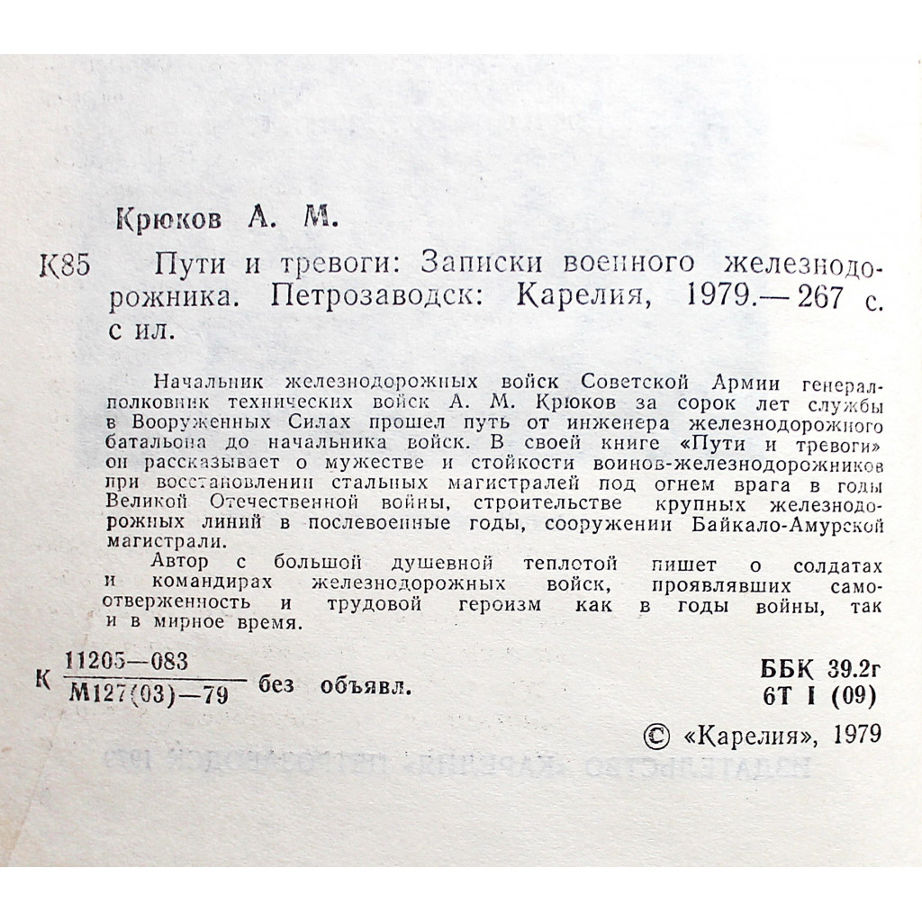 Начальник железнодорожных войск Советской Армии генерал-полковник технических войск А.М.Крюков за сорок лет службы в Вооруженных Силах прошел путь от инженера железнодорожного батальона до начальника войск. В своей книге 'Пути и тревоги' он рассказывает о мужестве и стойкости воинов-железнодорожников. Эти качества никогда не изменяли воинам стальных магистралей - при восстановлении железных дорог в годы Великой Отечественной войны, в строительстве крупных железнодорожных линий послевоенных лет, в сооружении Байкало-Амурской магистрали. Автор с большой душевной теплотой пишет о солдатах и командирах железнодорожных войск, проявлявших самоотверженность и трудовой героизм как в годы войны, так и в мирное время.