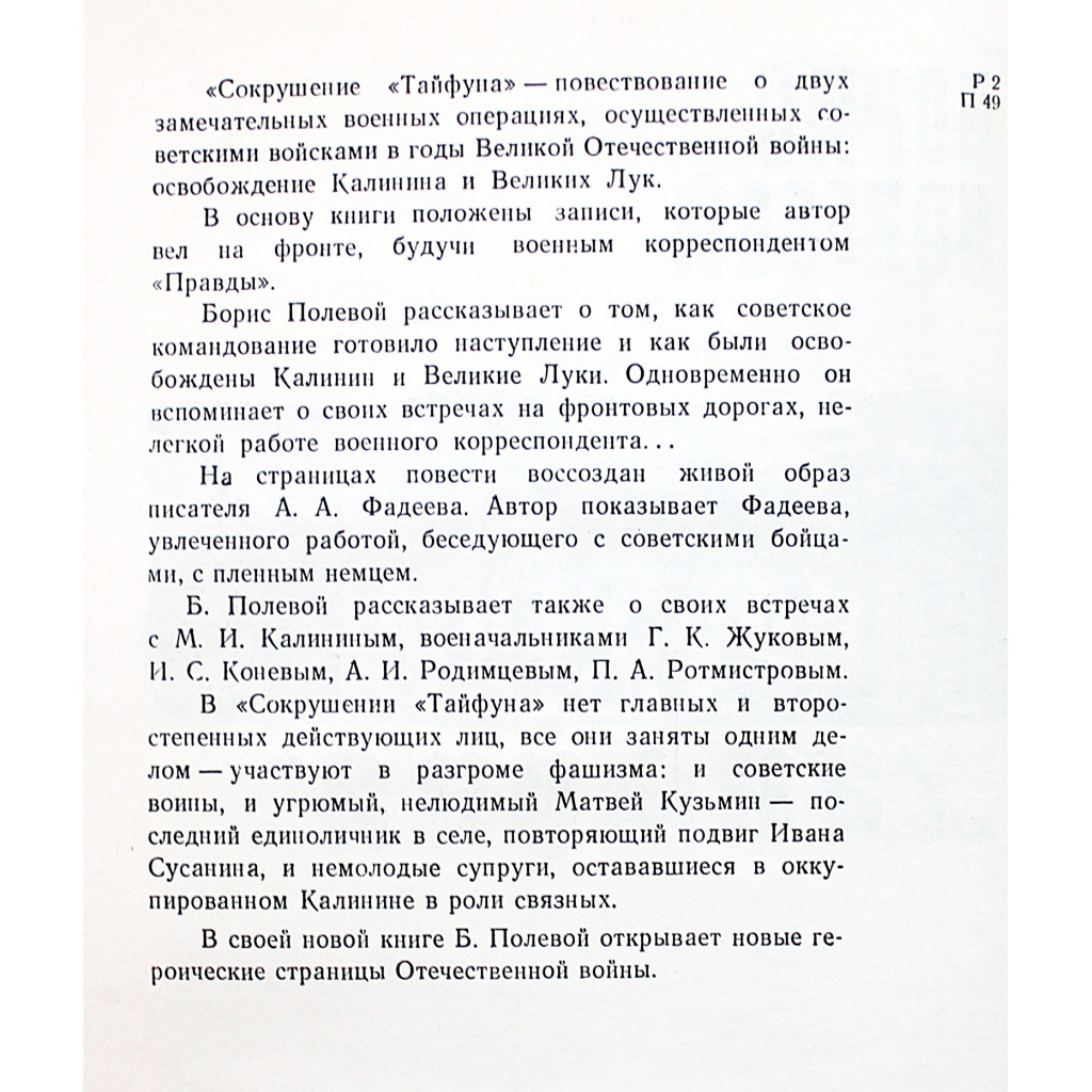 Сокрушение Тайфуна - повествование о двух замечательных военных операциях, осуществленных советскими войсками в годы Великой Отечественной войны: освобождение Калинина и Великих Лук. В основу книги положены записи, которые автор вел на фронте, будучи военным корреспондентом Правды. Борис Полевой рассказывает о том, как советское командование готовило наступление и как были освобождены Калинин и Великие Луки. Одновременно он вспоминает о своих встречах на фронтовых дорогах, нелегкой работе военного корреспондента... На страницах повести воссоздан живой образ писателя А.А. Фадеева. Автор показывает Фадеева, увлеченного работой, беседующего с советскими бойцами, с пленным немцем. Б. Полевой рассказывает также о своих встречах с М.И. Калининым, военачальниками Г.К. Жуковым, И.С. Коневым, А.И. Родимцевым, П.А. Ротмистровым. В Сокрушении Тайфуна нет главных и второстепенных действующих лиц, все они заняты одним делом- участвуют в разгроме фашизма: и советские воины, и угрюмый, нелюдимый Матвей Кузьмин - последний единоличник в селе, повторяющий подвиг Ивана Сусанина, и немолодые супруги, остававшиеся в оккупированном Калинине в роли связных.