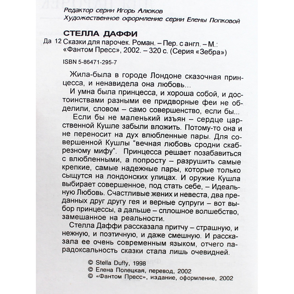 "Сказки для парочек" - книга о любви, но вовсе не о той любви, которая до гроба, в которой сгораешь и т.д. Это исследование любви как феномена, душевного и физиологического. Книга о том, как вырезают сердце, и как оно прорастает вновь. В своем исследовании любви Стелла Даффи не пощадила никого и ничего - ни женщин, ни мужчин, ни саму любовь. С характерным для ее творчества скрупулезностью, вдохновением и прямо-таки детским желанием "посмотреть, что там, внутри", Даффи написала жестокую, печальную и нежную притчу о любви, о том, что жизнь с любовью несовместима. Это постфеминисткая сказка о том, как некая прекрасная принцесса решила уничтожить любовь. Сказка пугающая, ироничная, поэтичная и парадоксальная. Как и полагается всякой порядочной сказке, начинаются "Сказки для парочек" словами "В некотором царстве, в некотором государстве…"