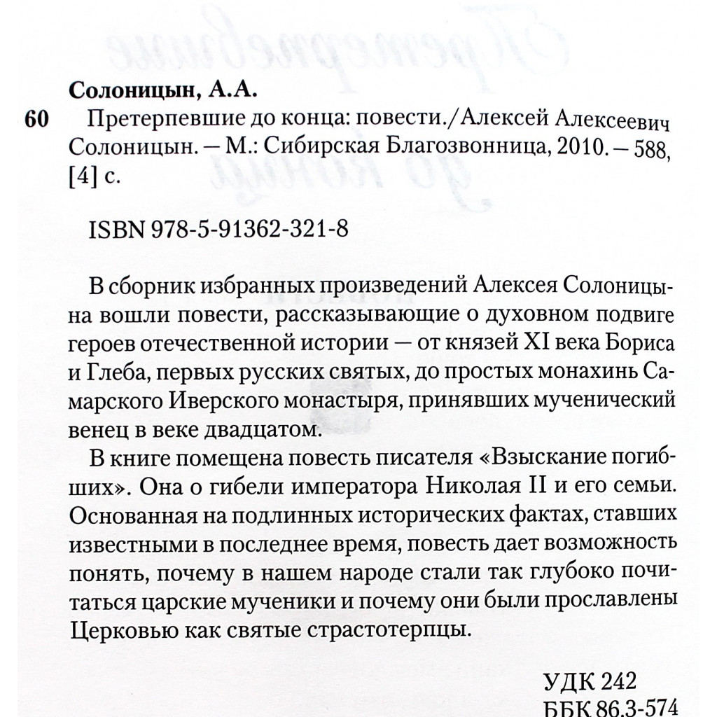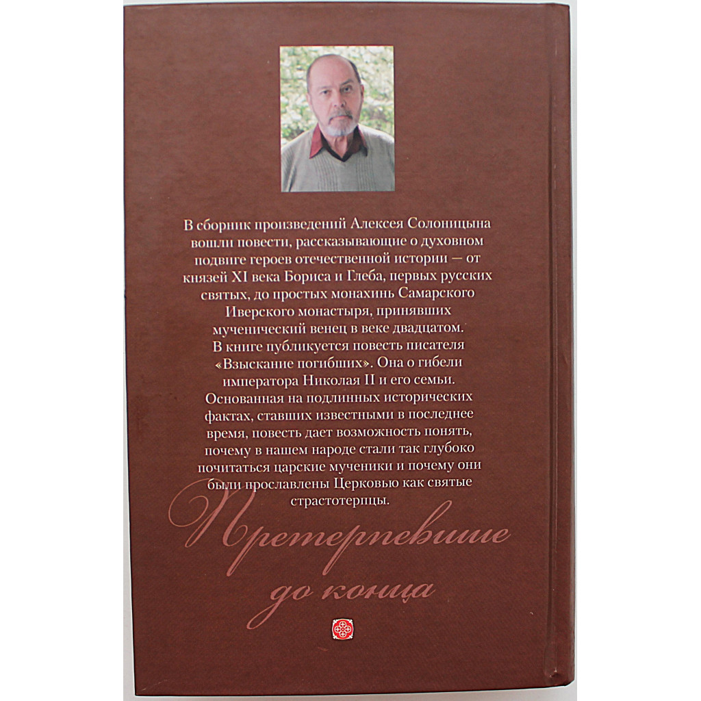 Сборник повестей Алексея Солоницына «Претерпевшие до конца» посвящён духовному подвигу героев отечественной истории — от XI века, когда князья Борис и Глеб стали первыми русскими святыми, до XX века, когда монахини Самарского Иверского монастыря приняли мученическую смерть. В книгу вошла повесть «Взыскание погибших», основанная на достоверных исторических фактах и посвящённая трагической гибели императора Николая II и его семьи. Произведение помогает понять, почему царские мученики так глубоко почитаются в народе и как они были канонизированы Церковью как святые страстотерпцы.