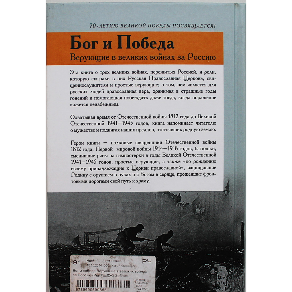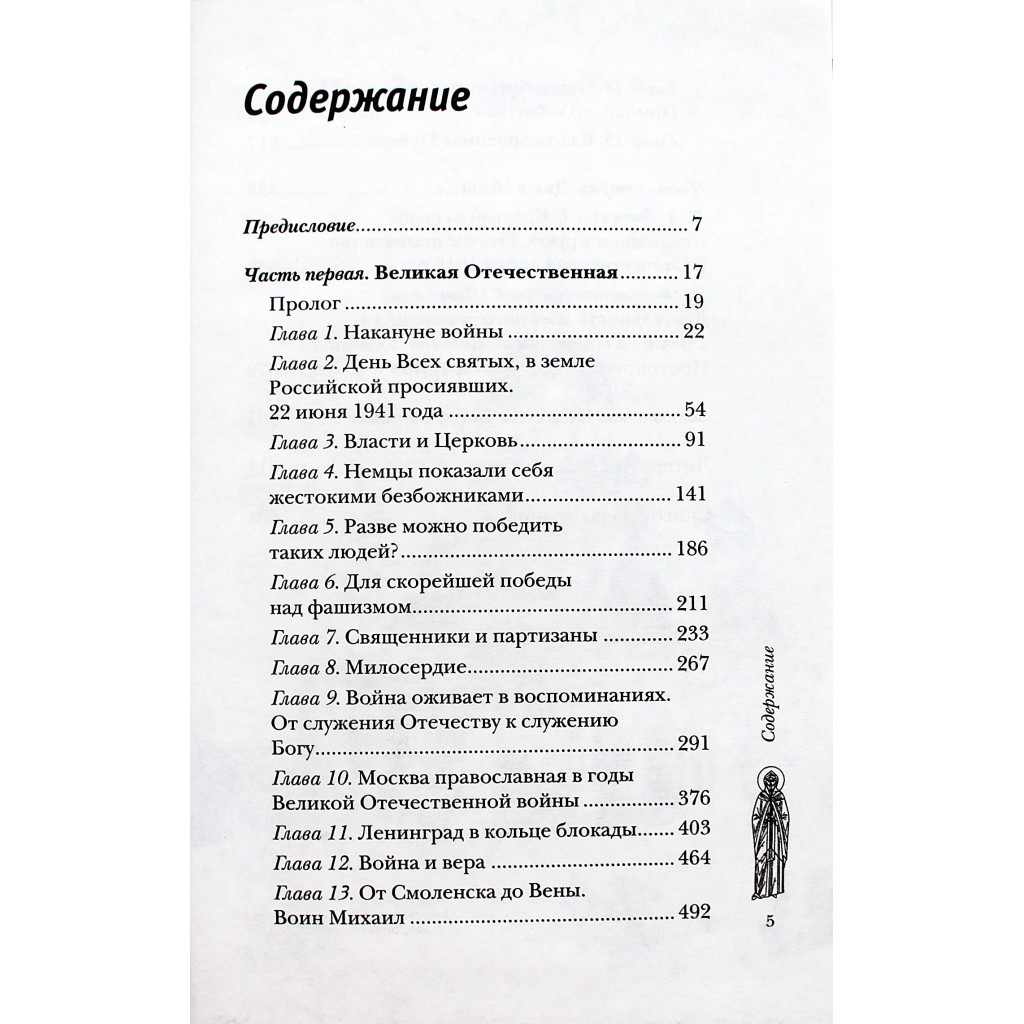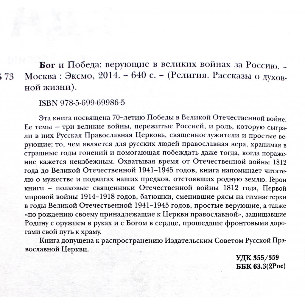 Эта книга посвящена 70-летию Победы в Великой отечественной войне. Ее темы - три великие войны, пережитые Россией, и роль, которую сыграли в них Русская Православная Церковь, священнослужители и простые верующие; то, чем является для русских людей православная вера, хранимая в страшные годы гонений и помогающая побеждать даже тогда, когда поражение кажется неизбежным. Охватывая время от Отечественной войны 1812 года до Великой Отечественной 1941–1945 годов, книга напоминает читателю о мужестве и подвигах наших предков, отстоявших родную землю. Герои книги – полковые священники Отечественной войны 1812 года, Первой Мировой войны 1914–1918 годов, батюшки, сменившие рясы на гимнастерки в годы Великой Отечественной 1941–1945 годов, простые верующие, а также "по рождению своему принадлежащие к Церкви православной", защищавшие Родину с оружием в руках и с Богом в сердце, прошедшие фронтовыми дорогами свой путь к храму.