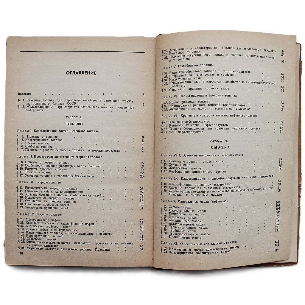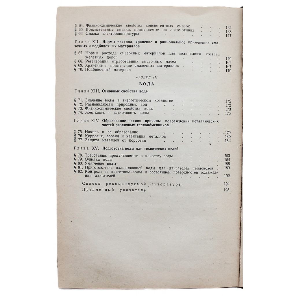 Книга состоит из трех разделов. В первом - рассматриваются классификация, состав и основные свойства различных видов топлива, пути экономии топлива и нормирование его расхода на тепловозах. Во втором разделе даются основные свойства, методы получения и использования смазочных масел; в третьем - состав и свойства природных вод, причины образования накипи и коррозии металлов, методы предварительной обработки воды и подготовки ее для охлаждения тепловозных дизелей и питания паровозных котлов.