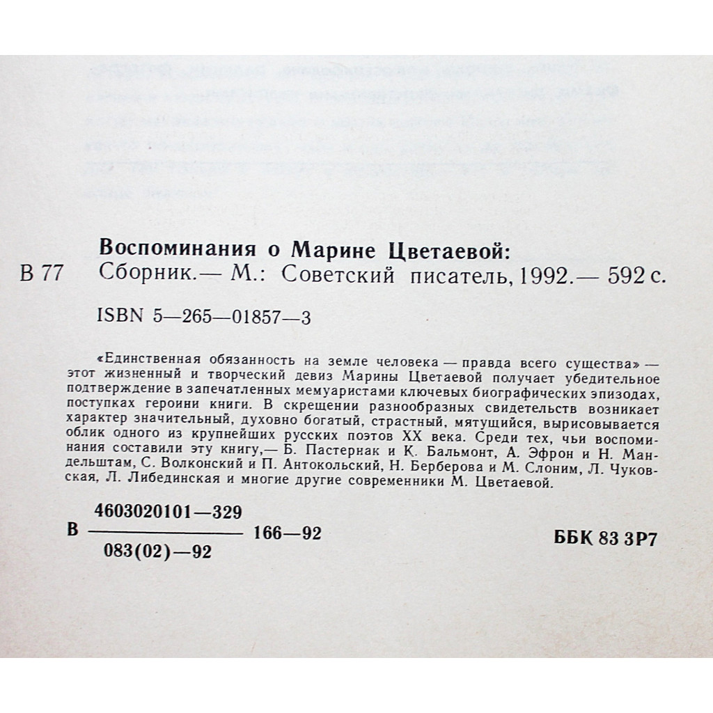 Единственная обязанность на земле человека - правда всего существа' - этот жизненный и творческий девиз Марины Цветаевой получает убедительное подтверждение в запечатленных мемуаристами ключевых биографических эпизодах, поступках героини книги. В скрещении разнообразных свидетельств возникает характер значительный, духовно богатый, страстный, мятущийся, вырисовывается облик одного из крупнейших русских поэтов XX века. Среди тех, чьи воспоминания составили эту книгу, - Б. Пастернак, К. Бальмонт, А. Эфрон, Н. Мандельштам, С. Волконский, П. Антокольский, Н. Берберова и М. Слоним, Л. Чуковская, Л. Либединская и многие другие современники М. Цветаевой.
