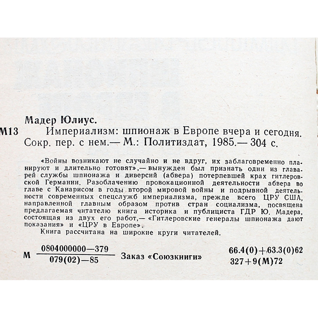 "Войны возникают не случайно и не вдруг, их заблаговременно планируют и длительно готовят", - вынужден был признать один из главарей службы шпионажа и диверсий (абвера) потерпевшей крах гитлеровской Германии. Разоблачению провокационной деятельности абвера во главе с Канарисом в годы второй мировой войны и подрывной деятельности современных спецслужб империализма, прежде всего ЦРУ США, направленной главным образом против стран социализма, посвящена предлагаемая читателю книга историка и публициста ГДР Ю. Мадера, состоящая из двух его работ, - "Гитлеровские генералы шпионажа дают показания" и "ЦРУ в Европе".