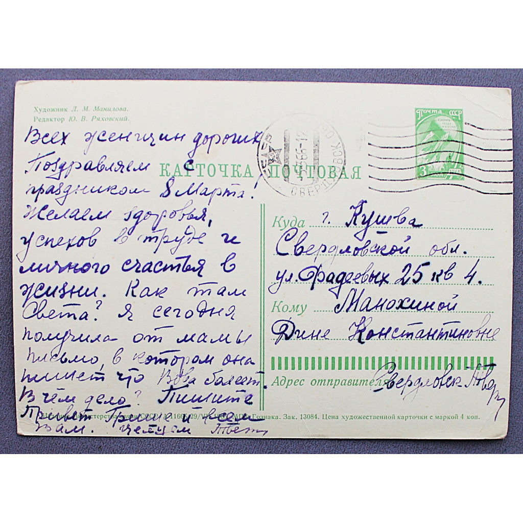 СССР почтовая открытка «8 МАРТА». Солнце (Мин связи, 1965) Манилова (подпис)