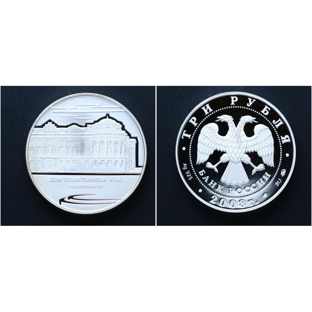 Россия 3 Рубля 2008 ММД год. Серебро 925. Дом Севастьянова Екатеринбург. Пруф