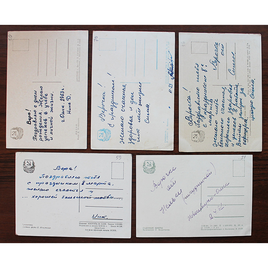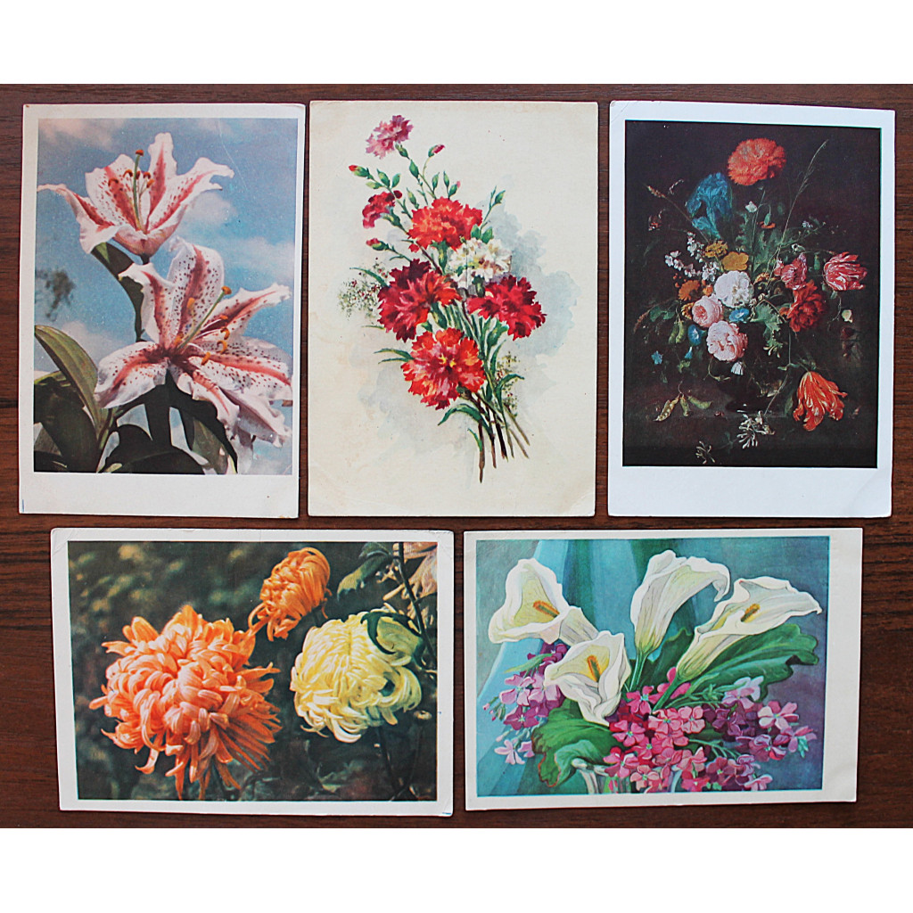 СССР комплект из 5 открыток "ЦВЕТЫ". Хризантемы. Лилии. Гвоздики (Изогиз, 1959-1962 гг.) Подписаны