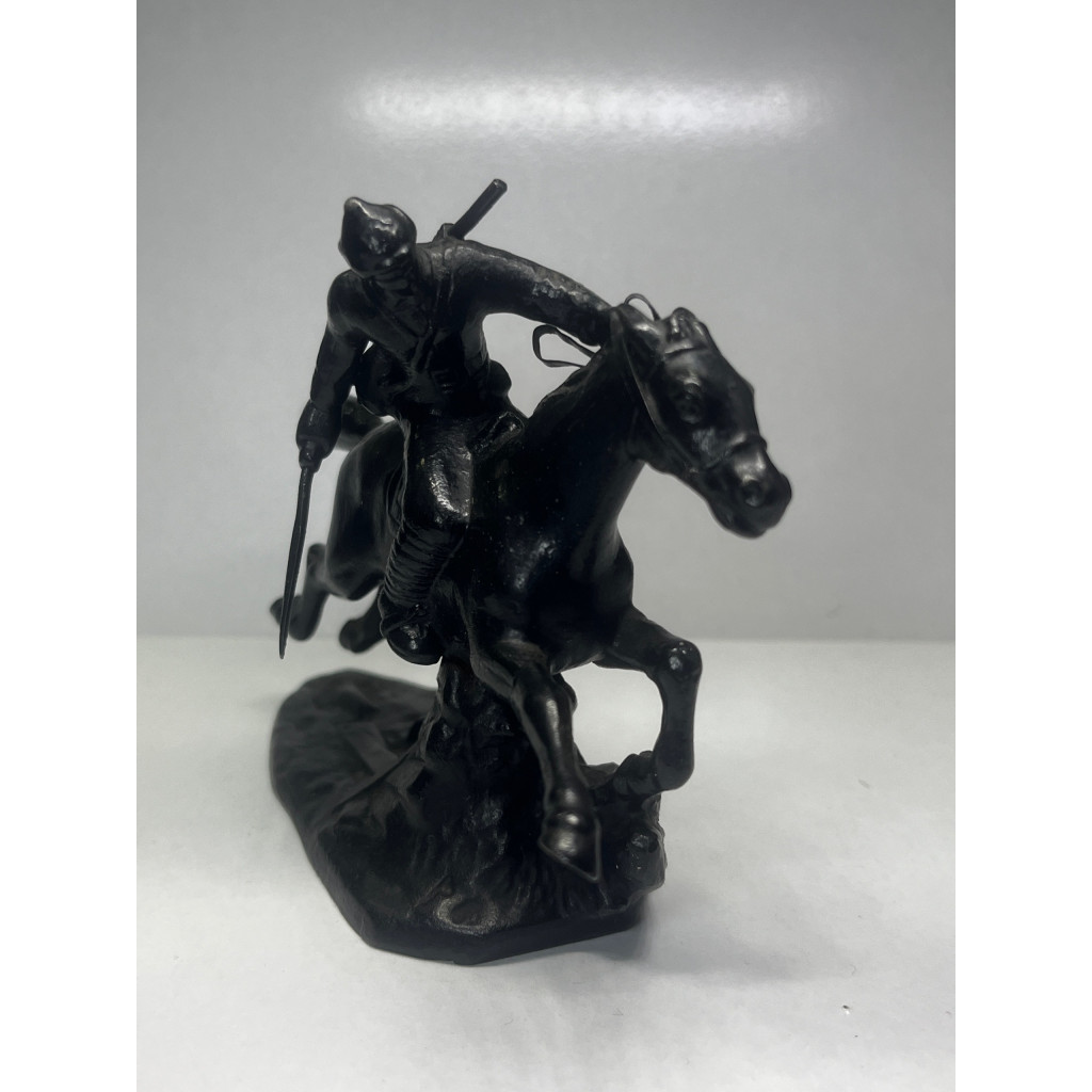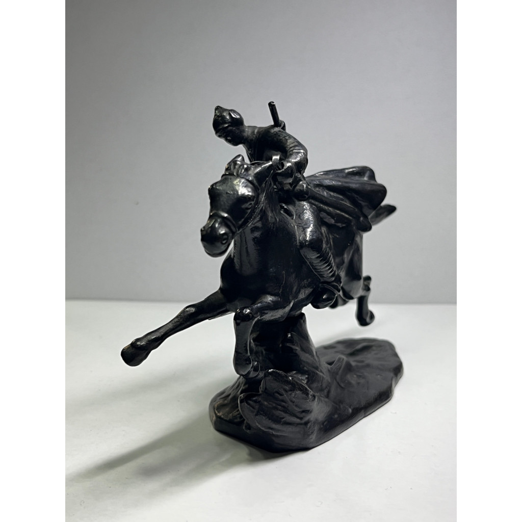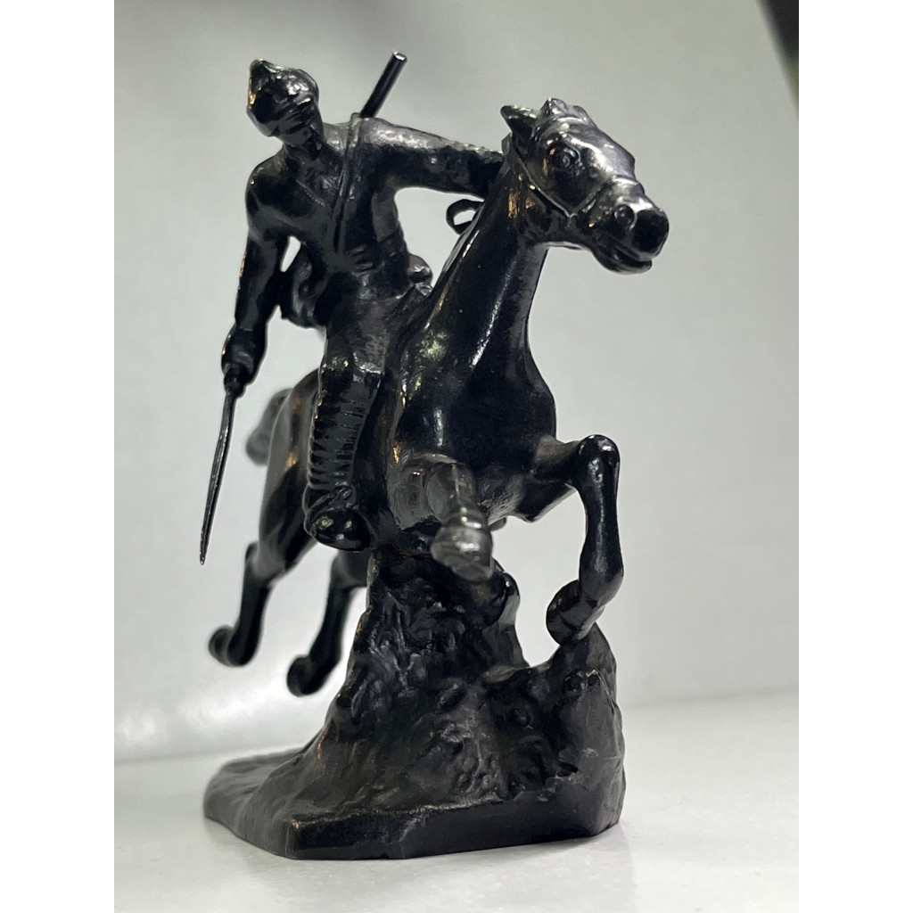 Скульптура изображает всадника-красноармейца в характерном головном уборе — будёновке, стремительно скачущего на коне с саблей в руке.