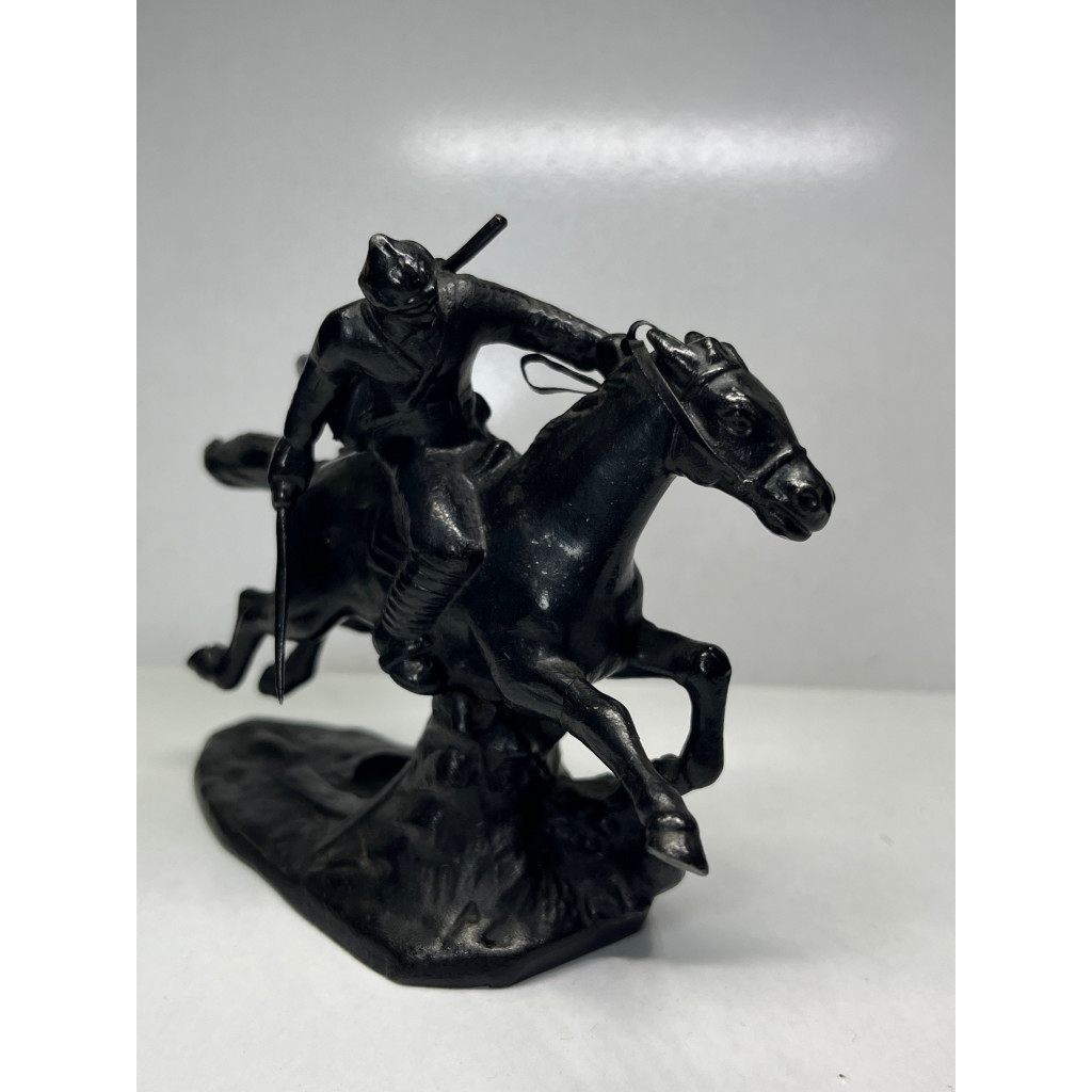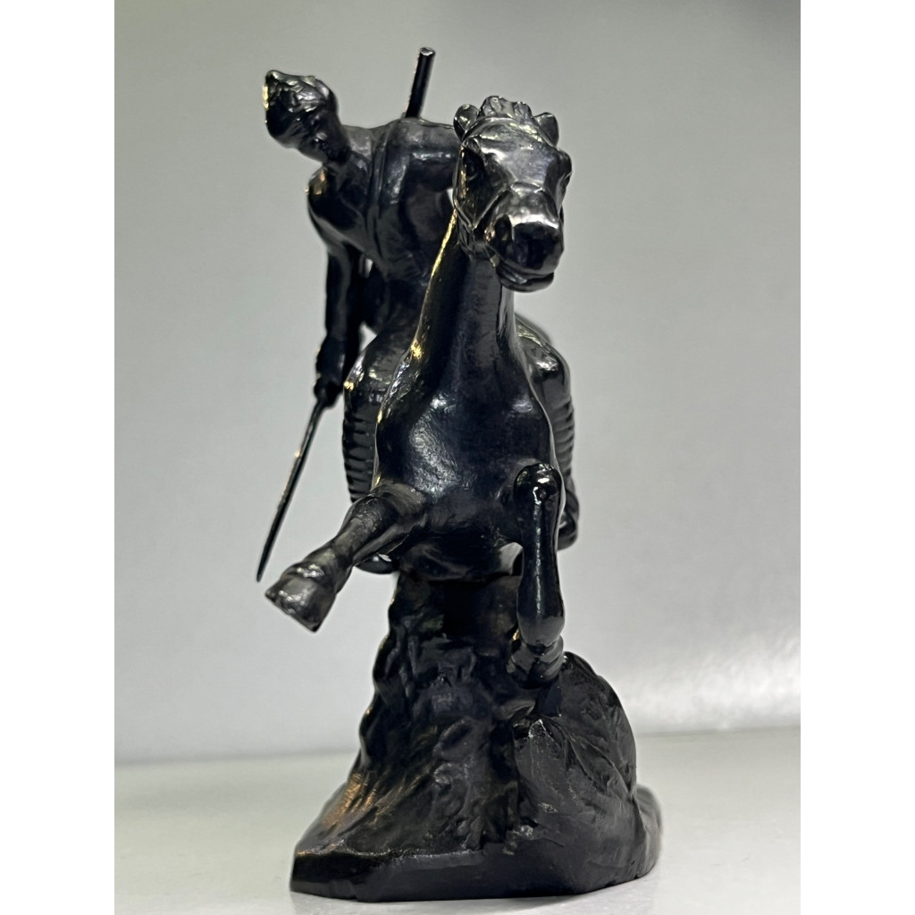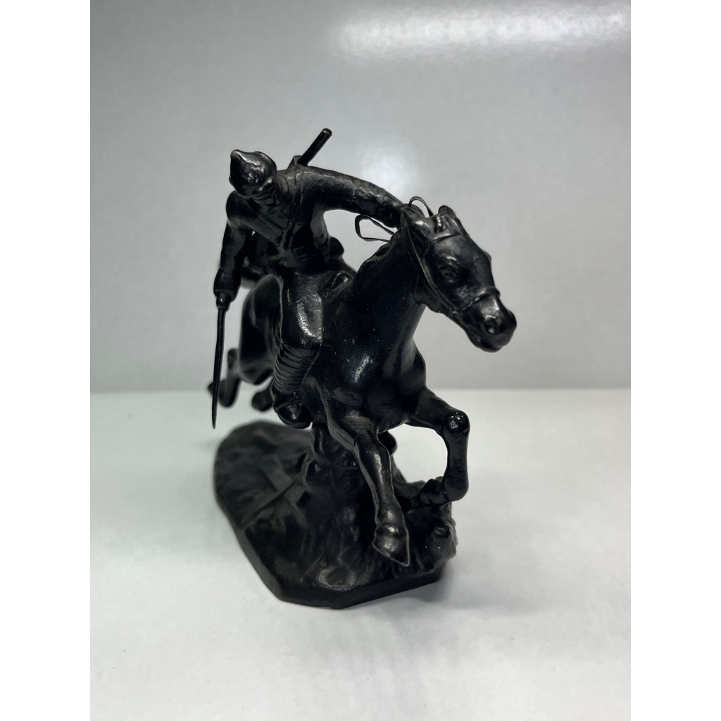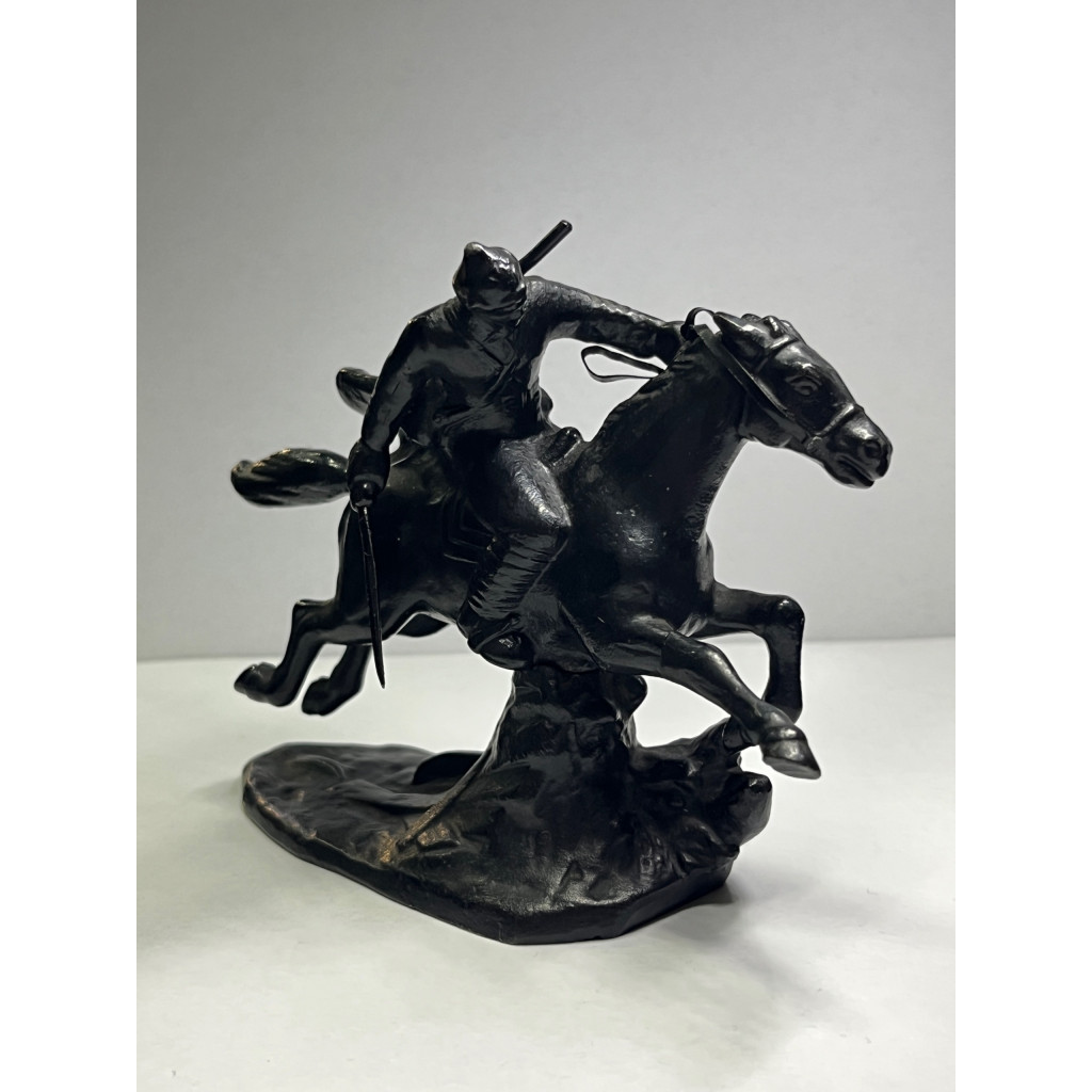 Скульптура изображает всадника-красноармейца в характерном головном уборе — будёновке, стремительно скачущего на коне с саблей в руке.