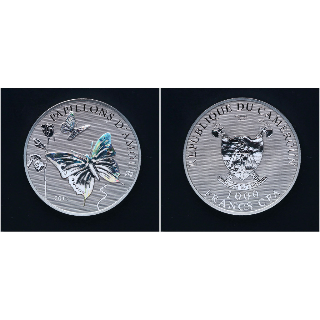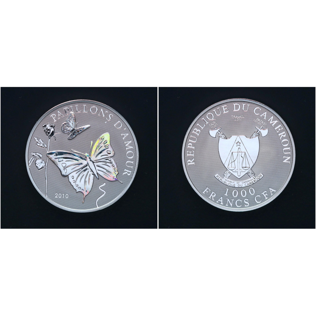 Камерун КФА 1000 Франков 2010 год. Серебро 925. Бабочки любви. Голограмма BUNC
