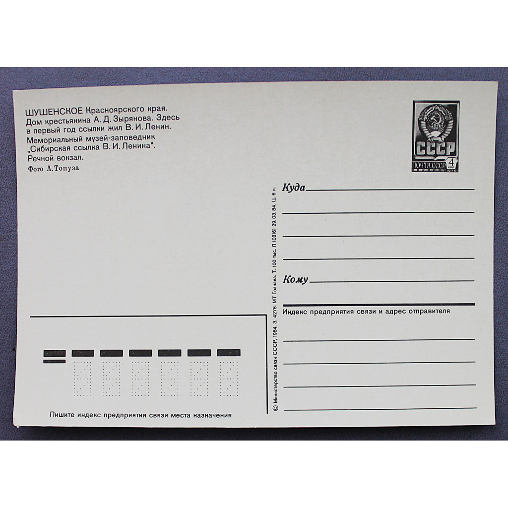 СССР почтовая открытка «ШУШЕНСКОЕ». Краснодарский край (Мин связи, 1984) Чистая