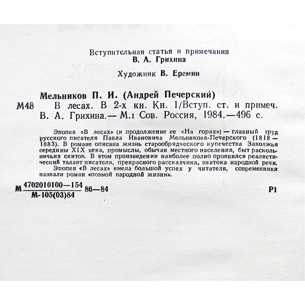 Эпопея "В лесах" (и продолжение ее "На горах") - главный труд русского писателя Павла Ивановича Мельникова-Печерского (1818 - 1883). В романе описана жизнь старообрядческого купечества Заволжья середины XIX века, промыслы, обычаи местного населения, быт раскольничьих скитов. В этом произведении наиболее полно проявился реалистический талант писателя, прекрасного рассказчика, знатока народной речи.
