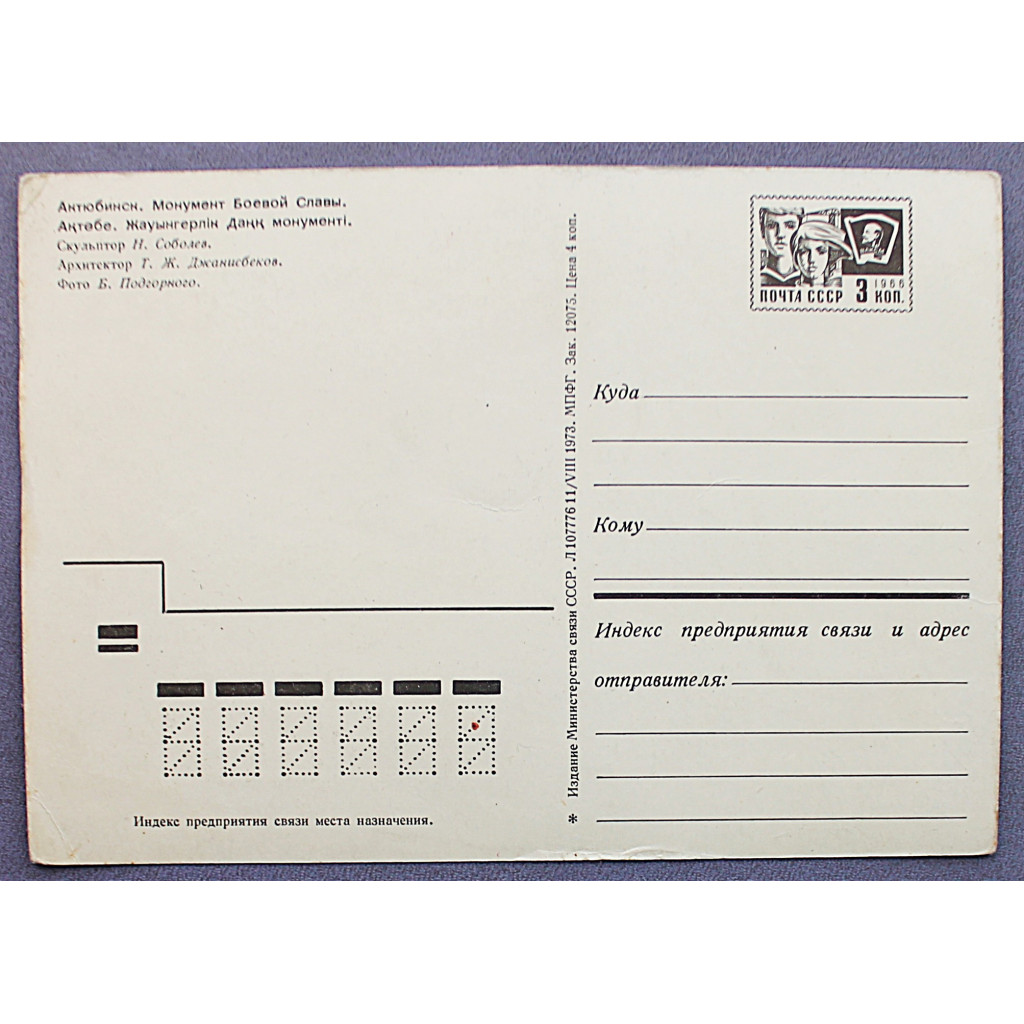 СССР почтовая открытка «АКТЮБИНСК». Монумент Боевой Славы (Мин связи, 1973) Чистая