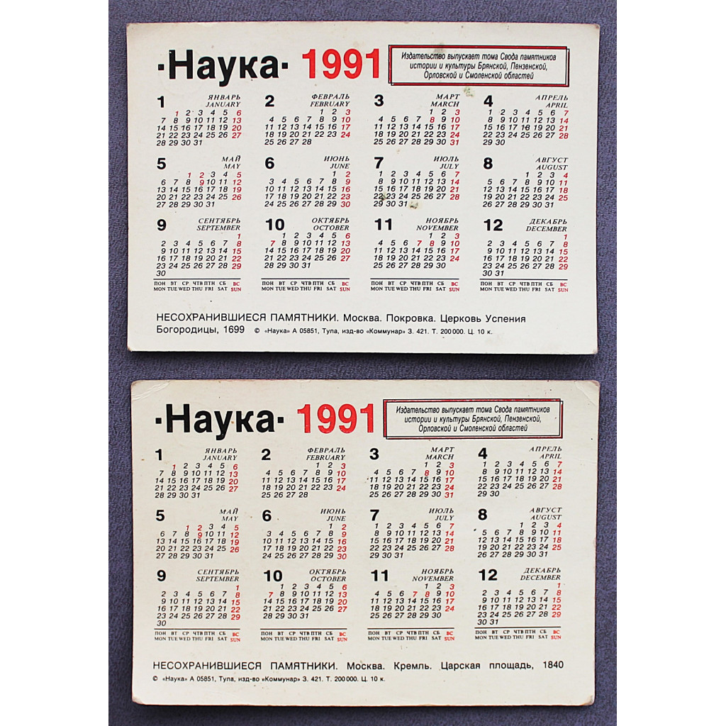 СССР пара карманных календарей за 1991 год "Несохранившиеся памятники". Москва. Церковь Успения. Царская площадь