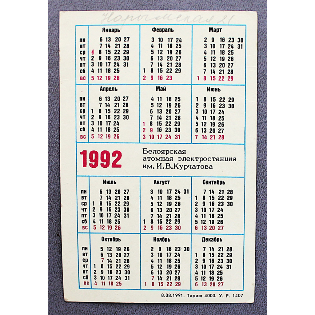 Карманный календарь за 1992 год. «БАЭС». Белоярская атомная электростанция имени И.В. Курчатова