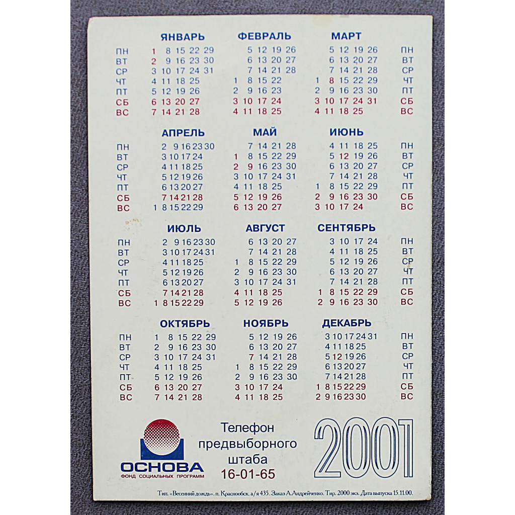 Календарь карманный на 2001 год. Андрей АНДРЕЙЧЕНКО. Кандидат в депутаты Горсовета (Новосибирск)