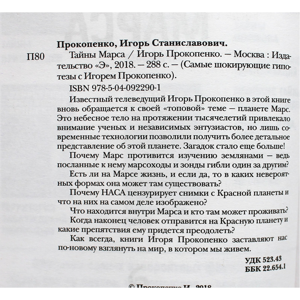 Известный телеведущий Игорь Прокопенко в этой книге вновь обращается к своей "топовой" теме - планете Марс. Это небесное тело на протяжении тысячелетий привлекало внимание ученых и независимых энтузиастов, но лишь современные технологии позволили получить более детальное представление об этой планете. Загадок стало еще больше! Почему Марс противится изучению землянами - ведь посланные к нему марсоходы и зонды гибли один за другим? Есть ли на Марсе жизнь, и если да, то в каких невероятных формах она может там существовать? Почему НАСА цензурирует снимки с Красной планеты и что на них на самом деле изображено? Что находится внутри Марса и кто там может проживать? Когда наконец человек отправится на Красную планету и какие препятствия ему придется преодолеть? Как всегда, книги Игоря Прокопенко заставляют нас по-новому взглянуть на мир, в котором мы живем.