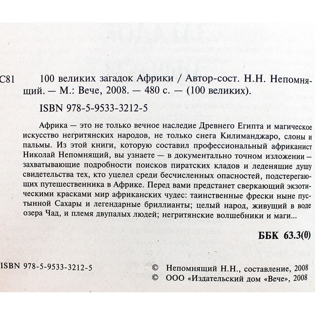 Африка – это не только вечное наследие Древнего Египта и магическое искусство негритянских народов, не только снега Килиманджаро, слоны и пальмы. Из этой книги, которую составил профессиональный африканист Николай Непомнящий, вы узнаете – в документально точном изложении – захватывающие подробности поисков пиратских кладов и леденящие душу свидетельства тех, кто уцелел среди бесчисленных опасностей, подстерегающих путешественника в Африке. Перед вами предстанет сверкающий экзотическими красками мир африканских чудес: таинственные фрески ныне пустынной Сахары и легендарные бриллианты; целый народ, живущий в воде озера Чад, и племя двупалых людей; негритянские волшебники и маги...