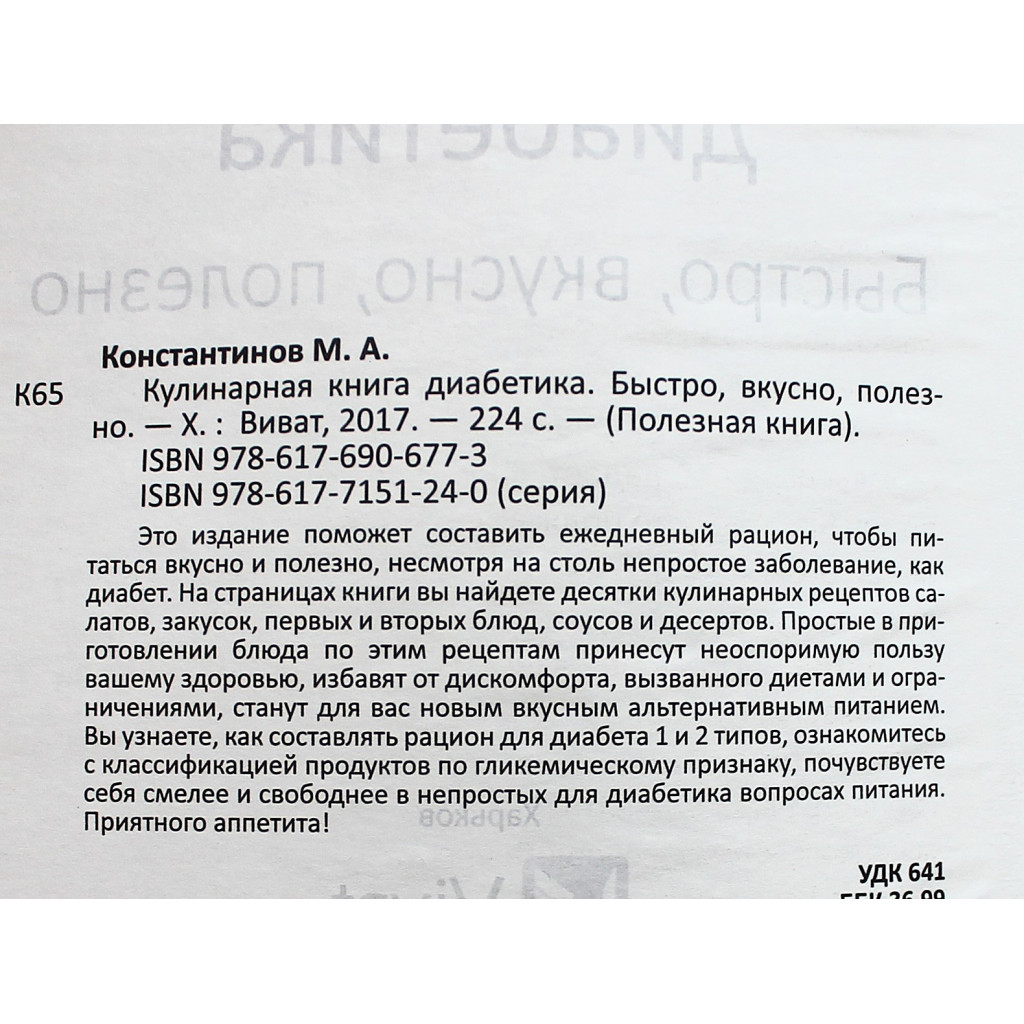 Это издание поможет составить ежедневный рацион, чтобы питаться вкусно и полезно, несмотря на столь непростое заболевание, как диабет. Вы найдете десятки рецептов салатов, закусок, первых и вторых блюд, соусов и десертов. Простые в приготовлении блюда по этим рецептам принесут неоспоримую пользу вашему здоровью, избавят от дискомфорта, вызванного диетами и ограничениями, станут для вас новым вкусным альтернативным питанием. Вы узнаете, как составлять рацион для диабета первого и второго типов, ознакомитесь с классификацией продуктов по гликемическому признаку, почувствуете себя смелее и свободнее в непростых для диабетика вопросах питания.